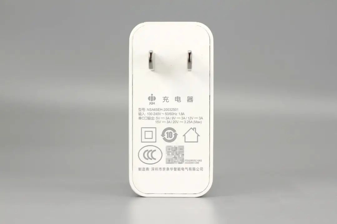 聯想這款充電器采用白色機身,固定插腳,標準的配機充電器設計。充電器支持65W PD快充,得益于通用的USB PD接口,這款充電器除了為配套的投影儀供電外,還能為筆記本供電,十分方便。