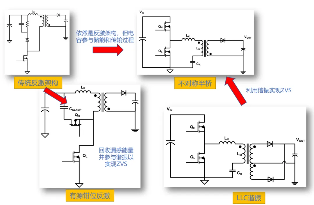 不對稱半橋AHB拓撲技術集成了LLC和反激的優點,實現了初級側零電壓開關(ZVS)和次級側零電流開關(ZCS),提高了系統的效率。通過采用電感與電容雙儲能元件,可以有效減小變壓器體積,從而提高系統的整體緊湊性。