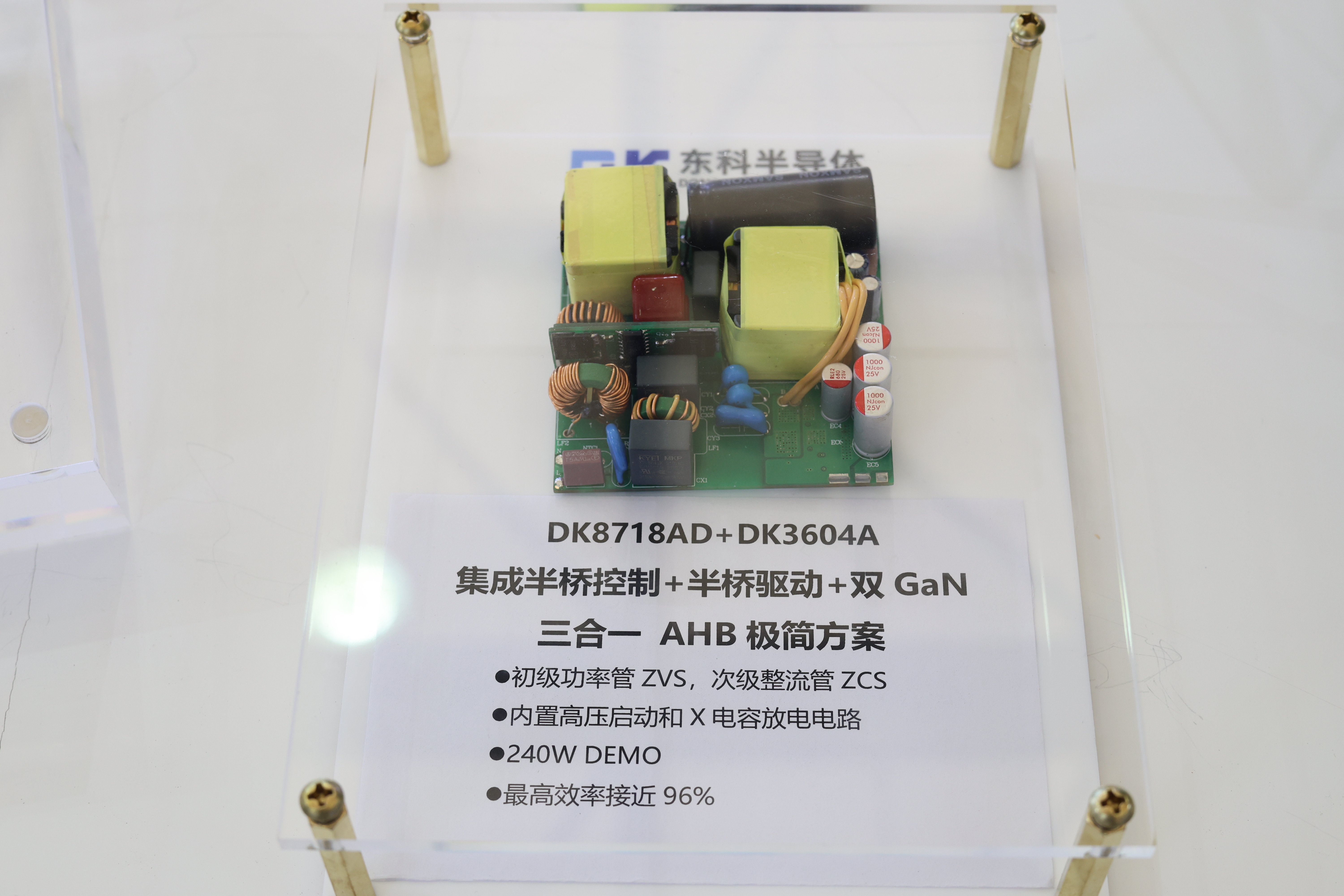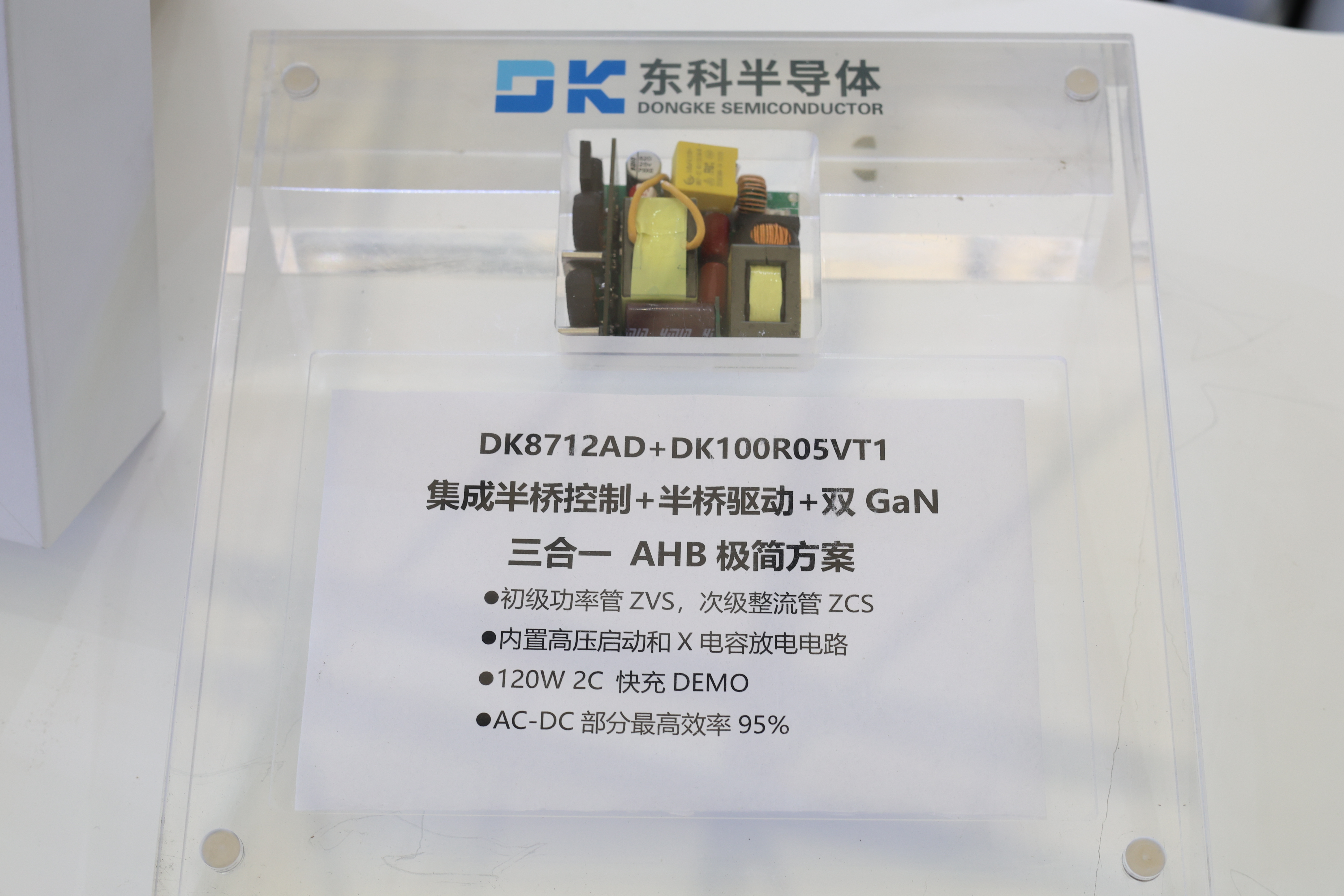 此次重磅展出了東科全新All-in-One全合封氮化鎵AC-DC電源管理芯片(不對稱半橋系列/有源箝位反激系列)。作為市面唯一的All-in-One全合封不對稱半橋解決方案DK87XXAD,有源箝位反激解決方案DK86XXAD。芯片采用三合一設計,單芯片集成AHB/ACF控制+半橋驅動+半橋GAN器件,實現了優異的總線控制功能,提供卓越的性能和效率。